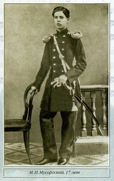 Кажется, судьба приготовила Модесту Мусоргскому легкий проторенный путь. Он был потомком древнего рода, занесенного в Бархатную книгу русского дворянства, к которому принадлежал один из Рюриковичей, князь Смоленский. Прадед композитора Григорий и дед Алексей были гвардейскими офицерами, собирался им стать и отец. Модест Мусоргский родился четвертым в семье Петра Алексеевича Мусоргского и Юлии Ивановны, урожденной Чириковой, дальним родственником которой был М. И. Кутузов-Смоленский. Отец был типичным русским помещиком типа Ноздрева: весельчак, хлебосол, кутила. Мать воспитывалась в благородном пансионе, слыла дамой образованной, была мягкой и доброй. В семье умерли подряд два ребенка, названных Алексеями, и следующих сыновей назвали Филаретом и Модестом. Мать мечтала видеть их гвардейскими офицерами. Она же заметила тягу Модеста к музыке еще в детстве и давала ему первые уроки музицирования и пения. В возрасте 10 лет, после завершения домашнего образования, в августе 1849 года Модест был определен в знаменитую Петришуле в Санкт-Петербурге, затем в частный пансион А. А. Комарова, где его и брата Филарета готовили к поступлению в Школу гвардейских подпрапорщиков. Одновременно Модест начал заниматься музыкой с одним из лучших музыкальных педагогов А. Герке, который не занимался с Мусоргским ни теорией музыки, ни композицией, хотя другим ученикам это преподавал. «Зачем это офицеру?» — вероятно, рассуждал он. Это в дальнейшем осложнило жизнь композитора Мусоргского: его считали самоучкой! Любопытно, что Герке был музыкальным «внуком» короля симфонии Бетховена (учился у ученика великого композитора), а Мусоргский не стал симфонистом. 1 сентября 1852 года Мусоргский поступил в Школу подпрапорщиков, где раньше учился М. Ю. Лермонтов. Он учится здесь довольно успешно, приобретает прекрасную пианистическую технику, блестяще читает ноты с листа и, обладая приятным баритоном, поет в церковном хоре. Мусоргского-второго (первым был Филарет) часто приглашали на вечера и пирушки, где он играл и пел арии из итальянских опер. Сохранился лишь один его опус того времени — полька «Подпрапорщик». Однако у него стали проявляться опасные черты: привычка к кутежам, безалаберности и мотовству. Однажды А. Сутгоф, директор школы, благоволивший Мусоргскому, сказал ему: «Какой же, mon cher, выйдет из тебя офицер?» Но офицер все-таки вышел: 16 июня 1856 года высочайшим указом Александра II Мусоргский был произведен в прапорщики и зачислен в привилегированный лейб-гвардии Преображенский полк.