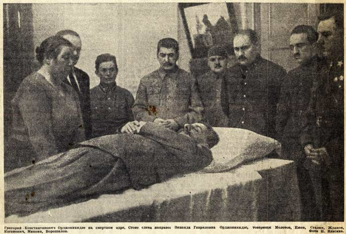Очень показательное фото: жена и "вожди" около тела "самоубийцы". Кроме Есенина и Фадеева подобных фотографий не было в новейшей истории, но и там "вожди" не фигурировали. Поводов умереть у несомненно коморбидного Орджоникидзе было немало (и внешних и внутренних). А версия о самоубийстве появилась на XX съезде КПСС в речи Хрущева. Примечательно, что бесспорных самоубийц Келдыша,Легасова,Пуго,Ахромеева если и фотографировали то только для следственных дел. В отличие от Менжинского, Куйбышева и Горького лечащих врачей Орджоникидзе (кроме Казакова, которого не допустили лечить) к делу не привлекали (к тому моменту все, кроме Федорова, еще были живы). Вот одна из наших устойчивых легенд!