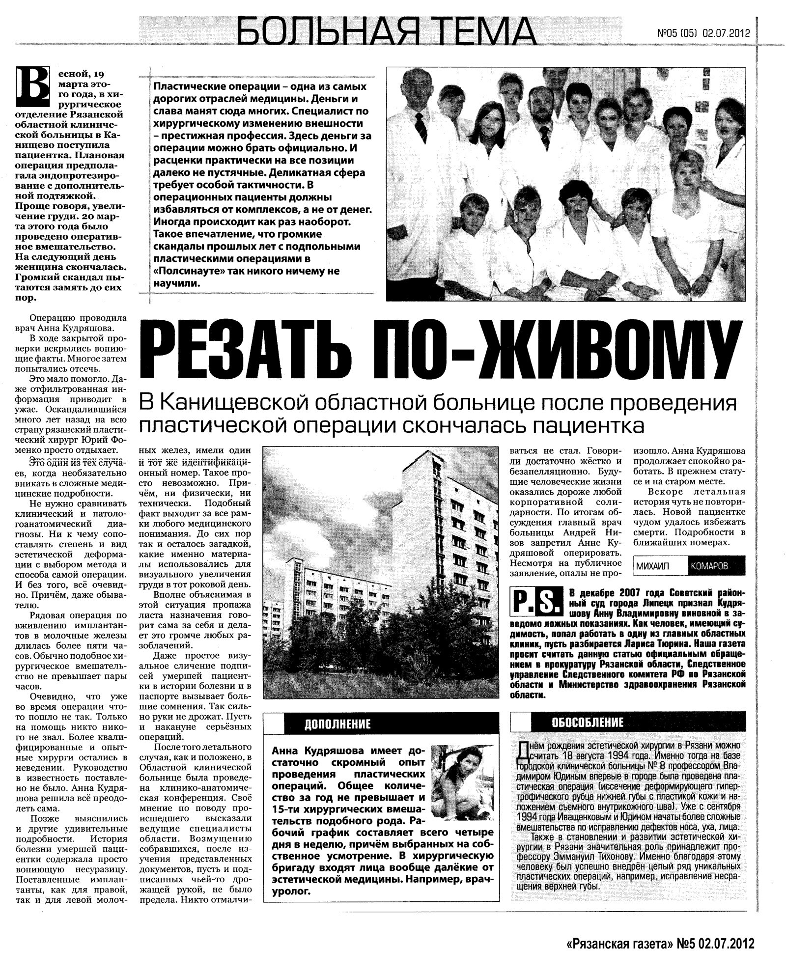 …или «Рязанской газетой».  Звание далекое от почетного. Региональный медийный продукт уже давно стал паноптикумом худших пиар технологий всех расцветок — от радужно белого до кроваво-черного. Пока «Рязанские ведомости» публикуют благодарственные письма трудящихся в адрес врачей РОКБ, другая «Рязанская газета» (№5 от 02.07 и №7 от 17.07) раскручивает PR-центрифугу темы очередной  смерти. «В канищевской больнице после пластической операции умерла пациентка» — с таким анонсом на перовой полосе  вышел один из номеров этого издания. В последнем выпуске повествование о «зверствах» местных хирургов продолжается статьей «Полсинаут» пластических операций». Естественно, громкое дело было подхвачено и растиражировано большинством сетевых СМИ. Бумажные носители информации предпочли остаться в стороне от цитирования: за три прошедшие недели ни одна местная газета не обмолвилась об инциденте. Лишь после объявления следственным комитетом начала расследования,  появилась заметка в «АиФ  Рязань» (20.07). Отреагировала и федеральная пресса. «Российская газета» (20.07) опубликовала материал «СК РФ проверяет смерть женщины после пластической операции в Рязани».